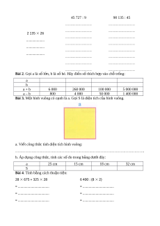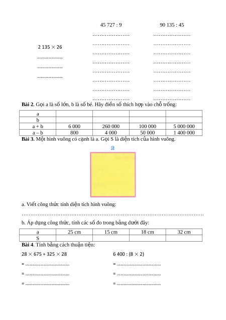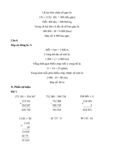 ế 11 phút. Vòng thứ hai Hi n ề ch y ạ h t ế 14 phút. V y ậ trung bình mỗi phút Hi n ch ề y ạ đư c s ợ ố mét là: A. 80 m B. 50 m C. 70 m D. 60 m II. Phần t l ự u n. ậ Bài 1. Đ t ặ tính r i ồ tính: 272 191 + 354 567 752 380 – 590 726 218 305 3 ………………… ………………… ………………… ………………… ………………… ………………… ………………… ………………… ………………… 45 727 : 9 90 135 : 45 ………………… ………………… ………………… ………………… 2 135 26 ………………… ………………… ………………… ………………… ………………… ………………… ………………… ………………… ………………… ………………… ………………… ………………… ………………… ………………… ………………… Bài 2. G i ọ a là số l n, ớ b là s bé. H ố ãy đi n s ề ố thích h p vào ch ợ t ỗ r ng: ố a b a + b 6 000 260 000 100 000 5 000 000 a – b 800 4 000 50 000 1 400 000 Bài 3. M t ộ hình vuông có c nh l ạ à a. G i ọ S là di n t ệ ích c a ủ hình vuông. a. Vi t ế công th c t ứ ính di n t ệ ích hình vuông: