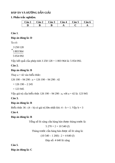 …………………………………………………………………………………………. ĐÁP ÁN VÀ HƯ N Ớ G D N Ẫ GI I Ả I. Phần tr c nghi ắ m ệ . Câu 1 Câu 2 Câu 3 Câu 4 Câu 5 Câu 6 D B B A C A Câu 1. Đáp án đúng là: D Ta có: 3 250 128 1803 964 5 054 092 V y ậ k t ế qu c ả a
