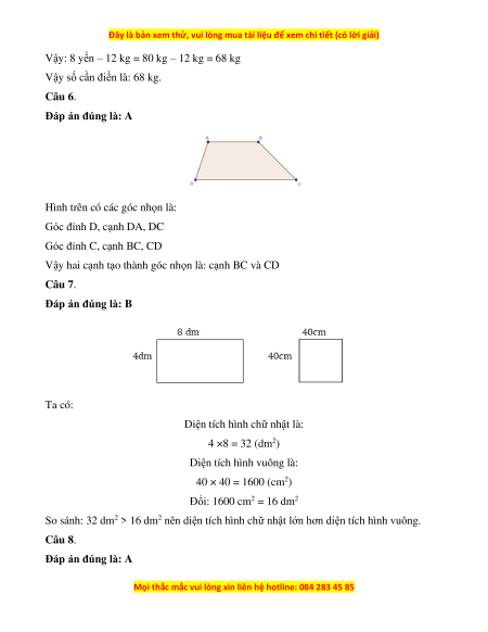 Câu 5. 8 yến – 12 kg = ..... Số thích hợp điền vào chỗ chấm là: A. 18 kg B. 68 kg C. 812 kg D. 788 kg