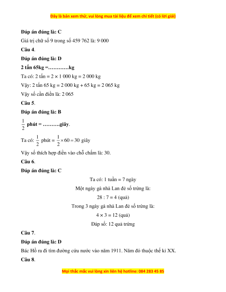 Câu 3. Giá trị chữ số 9 trong số 459 762 là: A. 90 000 B. 900 C. 9 000 D. 90