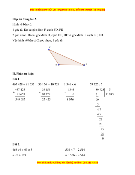 C. 1 góc vuông, 2 góc nhọn D. 2 góc vuông, 1 góc tù II. Phần tự luận