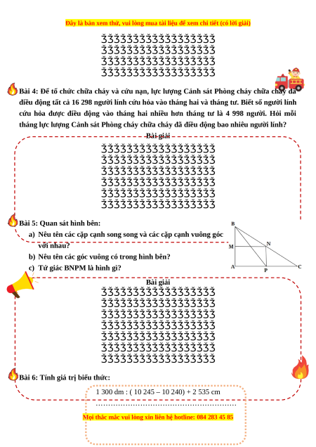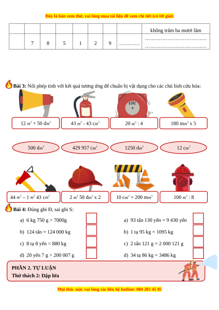 Bài 3: Nối phép tính với kết quả tương ứng để chuẩn bị vật dụng cho các chú lính cứu hỏa: 12 m2 + 50 dm2 43 m2 - 43 cm2 20 m2 : 4 180 mm2 x 5 500 dm2 429 957 cm2 1250 dm2 12 cm2