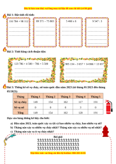 Bài 3: Thống kê số vụ cháy, nổ toàn quốc đầu năm 2023 (từ tháng 01/2023 đến tháng 05/2023): Tháng Tháng 1 Tháng 2 Tháng 3 Tháng 4 Tháng 5 Số vụ cháy 149 154 102 117 191 Số vụ nổ 0 0 0 3 0 Tổng 149 154 102 120 191