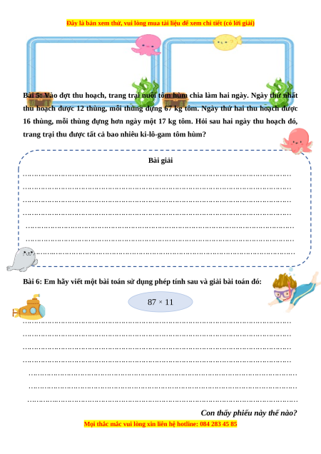Bài 6: Em hãy viết một bài toán sử dụng phép tính sau và giải bài toán đó: 87 × 11
