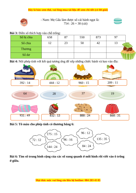 - Nam: Mẹ Gấu làm được số cái bánh ngọt là: 754 : 26 = 30 (cái)