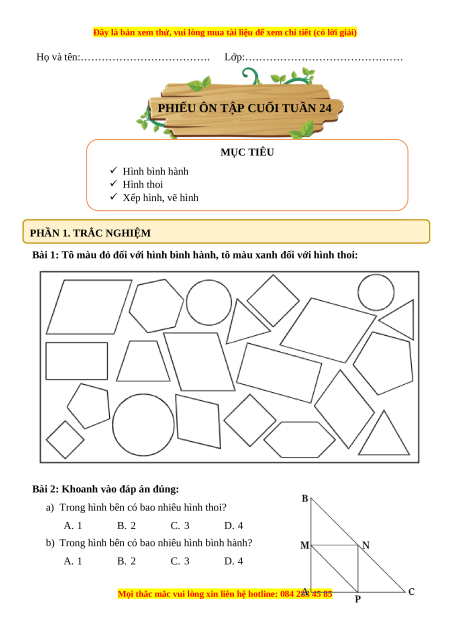 PHIẾU ÔN TẬP CUỐI TUẦN 24 MỤC TIÊU Hình bình hành Hình thoi Xếp hình, vẽ hình