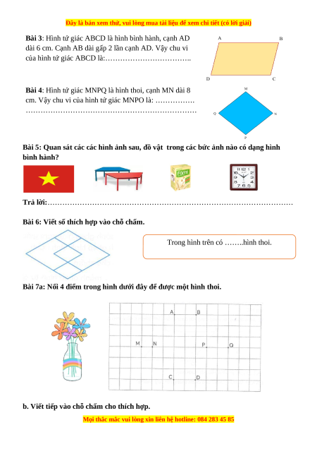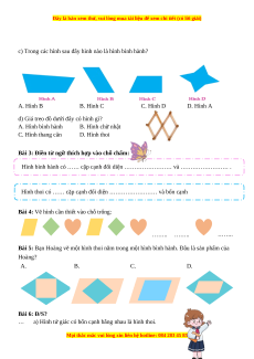 Bài 5: Bạn Hoàng vẽ một hình thoi nằm trong một hình bình hành. Đâu là sản phẩm của Hoàng? A. B. C. D. Bài 6: Đ/S? …