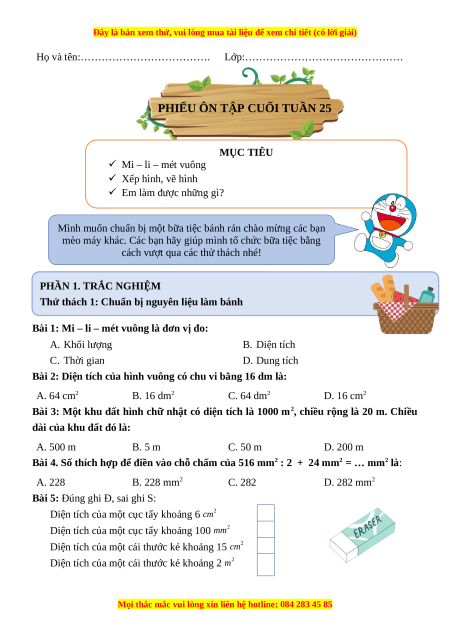 PHIẾU ÔN TẬP CUỐI TUẦN 25 MỤC TIÊU Mi – li – mét vuông Xếp hình, vẽ hình