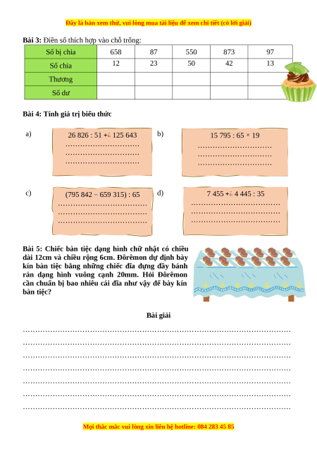 Bài 3: Điền số thích hợp vào chỗ trống: Số bị chia 658 87 550 873 97 Số chia 12 23 50 42 13 Thương Số dư