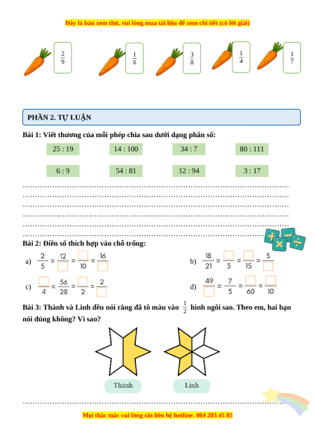 Bài 1: Viết thương của mỗi phép chia sau dưới dạng phân số: 25 : 19 14 : 100 34 : 7 80 : 111 6 : 9 54 : 81 12 : 94 3 : 17