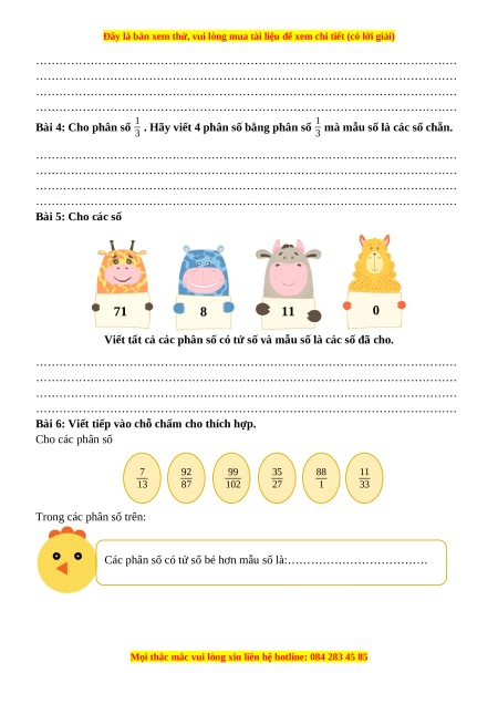 Bài 6: Viết tiếp vào chỗ chấm cho thích hợp. Cho các phân số 7 92 99 35 88 11 13 87 102 27 1 33 Trong các phân số trên:
