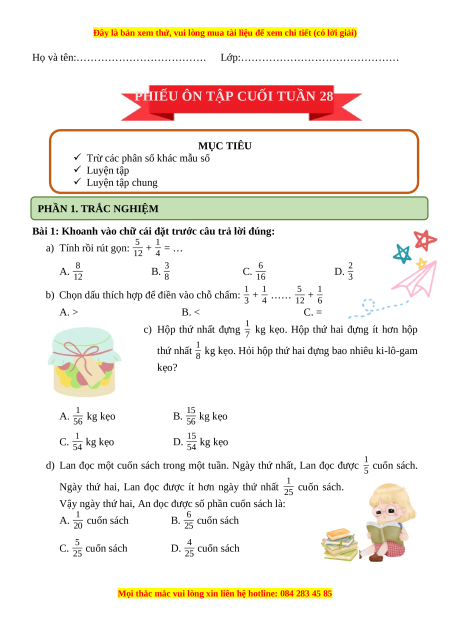 Vậy ngày thứ hai, An đọc được số phần cuốn sách là: 1 6 A. cuốn sách B. cuốn sách 20 25 5 4 C. cuốn sách D. cuốn sách 25 25