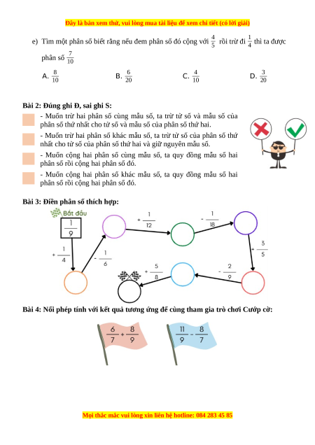 e) Tìm một phân số biết rằng nếu đem phân số đó cộng với rồi trừ đi thì ta được 5 4 7 phân số 10 8 6 4 3 A. B. C. D. 10 20 10 20