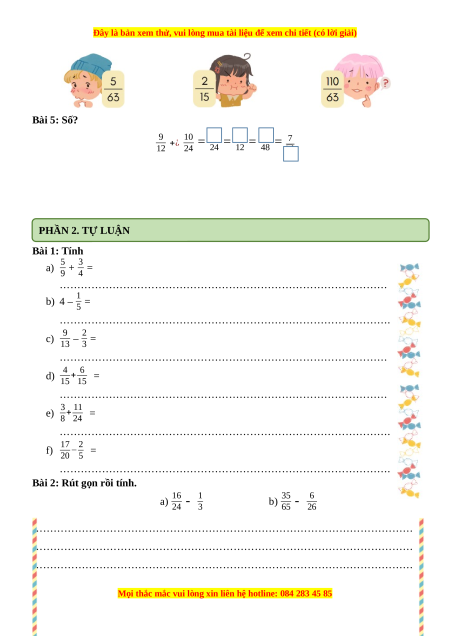 Bài 5: Số? 9 +¿ 10 = ❑ = ❑ = ❑ = 7 12 24 24 12 48 ❑ PHẦN 2. TỰ LUẬN Bài 1: Tính 5 3 a) + = 9 4