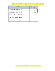 Góc Số đo góc Góc đỉnh A; cạnh AB, AC ………… Góc đỉnh A; cạnh AB, AH ………… Góc đỉnh B; cạnh BA, BC ………… Góc đỉnh C; cạnh CA, CB ………… Góc đỉnh H; cạnh HA, HC …………