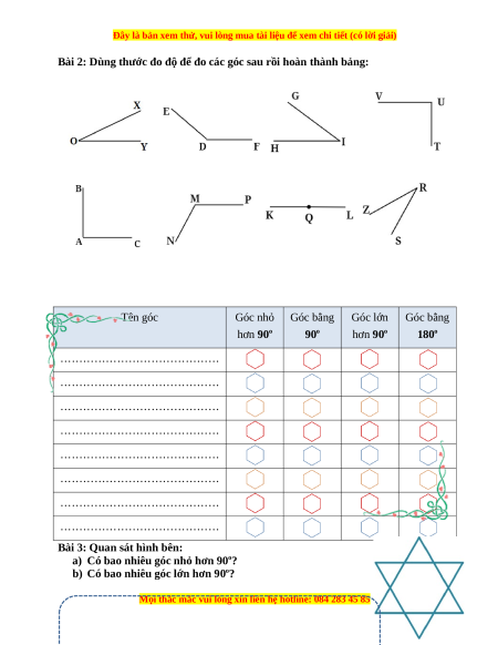 Bài 2: Dùng thước đo độ để đo các góc sau rồi hoàn thành bảng: Tên góc Góc nhỏ Góc bằng Góc lớn Góc bằng hơn 90o 90o hơn 90o 180o