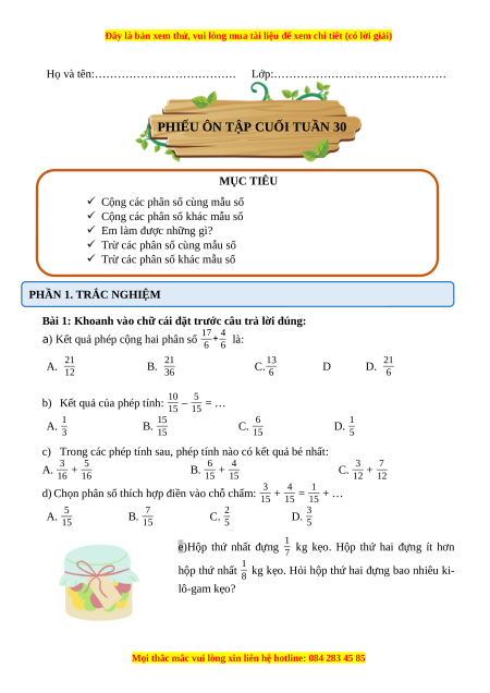 PHIẾU ÔN TẬP CUỐI TUẦN 30 MỤC TIÊU