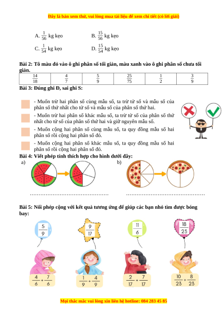 Bài 2: Tô màu đỏ vào ô ghi phân số tối giản, màu xanh vào ô ghi phân số chưa tối giản. 14 4 5 25 1 3 18 7 9 75 2 9
