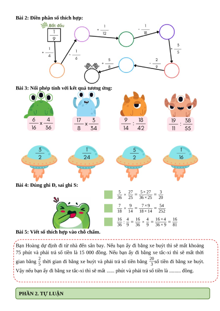 Vậy nếu bạn ấy đi bằng xe tắc-xi thì sẽ mất ...... phút và phải trả số tiền là ......... đồng. PHẦN 2. TỰ LUẬN Bài 1: Tính: 2 3 a)