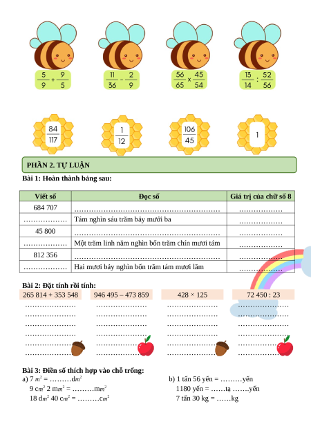 Bài 2: Đặt tính rồi tính: 265 814 + 353 548 946 495 – 473 859 428 × 125 72 450 : 23 ………………… ………………… ………………… ………………… ………………… ………………… ………………… ………………… ………………… ………………… ………………… ………………… ………………… ………………… ………………… ………………… ………………… ………………… ………………… ………………… ………………… ………………… ………………… …………………
