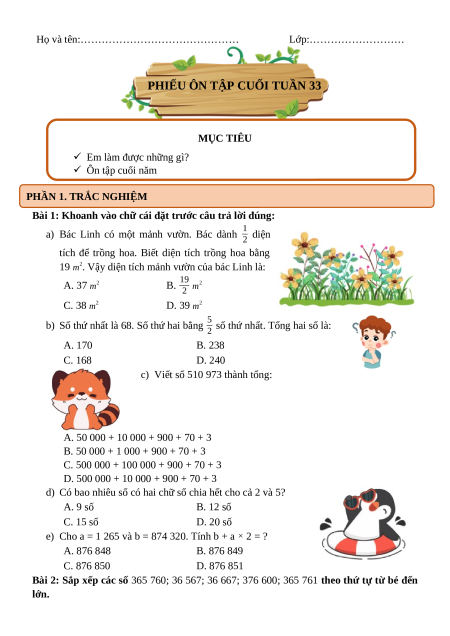 PHIẾU ÔN TẬP CUỐI TUẦN 33 MỤC TIÊU
