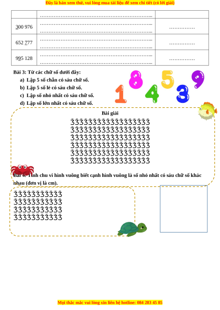 Bài 4: Tính chu vi hình vuông biết cạnh hình vuông là số nhỏ nhất có sáu chữ số khác nhau (đơn vị là cm). ǮǮǮǮǮǮǮǮǮǮǮ ǮǮǮǮǮǮǮǮǮǮǮ ǮǮǮǮǮǮǮǮǮǮǮ ǮǮǮǮǮǮǮǮǮǮǮ