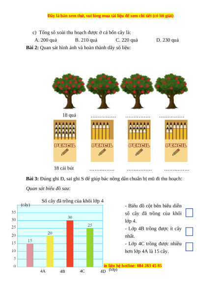 c) Tổng số xoài thu hoạch được ở cả bốn cây là: A. 200 quả B. 210 quả C. 220 quả D. 230 quả