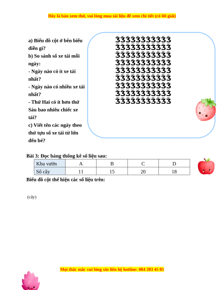 Bài 3: Đọc bảng thống kê số liệu sau: Khu vườn A B C D Số cây 11 15 20 18