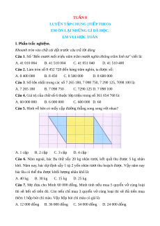 Câu 6. Năm ngoái, bác Ba thử s y ấ 20 kg nhãn tư i ơ , k t ế quả thu đư c ợ 5 kg nhãn khô. Năm nay, bác d ự đ nh ị s y ấ 1 t ạ 2 y n ế nhãn tư i ơ thu ho ch ạ đư c. ợ V y ậ năm nay bác Ba có th t ể hu đư c ợ kh i ố lư ng nhãn khô l ợ à: A. 40 kg B. 30 kg C. 15 kg D. 25 kg Câu 7. Mẹ đ a ư cho Minh 60 000 đ ng. ồ Minh tính n u ế mua 5 quy n ể vở cùng lo i ạ thì sẽ h t ế số ti n ề đó. Còn n u ế chỉ mua 3 quy n ể vở cùng lo i ạ thì sẽ đủ ti n ề mua thêm 1 h p ộ bút chì màu. V y ậ h p bút ộ chì màu có giá là: A. 12 000 đồng B. 36 000 đồng C. 34 000 đồng D. 24 000 đồng II. Phần t l ự u n. ậ Bài 1. Đi n vào ch ề ỗ trống cho thích h p: ợ a. Số 104 608 700 đ c l ọ à: