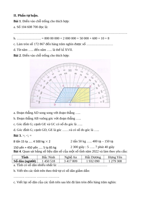 b. …………………. = 800 00 000 + 2 000 000 + 50 000 + 600 + 10 + 8 c. Làm tròn s 172 867 đ ố n hàng t ế răm nghìn đư c s ợ …………………… ố d. T năm ừ ….. đ n năm ế ….. là th k ế X ỉ VII. Bài 2. Đi n vào ch ề ỗ trống cho thích h p: ợ a. Đo n ạ th ng ẳ AD song song v i ớ đo n ạ th ng ẳ ….. b. Đo n ạ th ng ẳ AB vuông góc v i ớ đo n ạ th ng ….. ẳ c. Góc đ nh G ỉ ; c nh ạ GE và GC có s đo góc l ố à ….. d. Góc đ nh G ỉ ; c nh