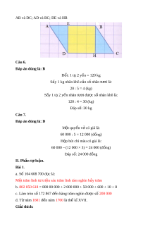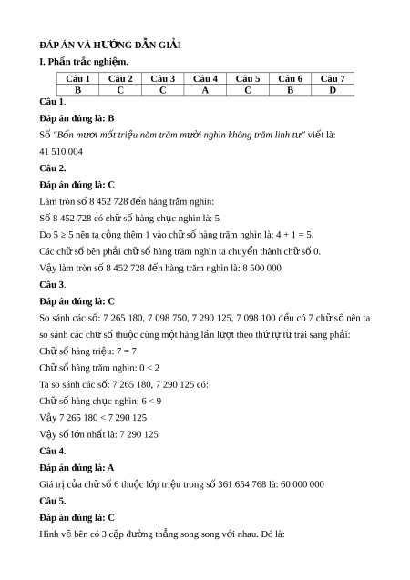 …………………………………………………………………………………………. ĐÁP ÁN VÀ HƯ N Ớ G D N Ẫ GI I Ả I. Phần tr c nghi ắ m ệ . Câu 1 Câu 2 Câu 3 Câu 4 Câu 5 Câu 6 Câu 7 B C C A C B D Câu 1. Đáp án đúng là: B Số "Bốn mư i ơ mốt tri u năm ệ trăm mư i