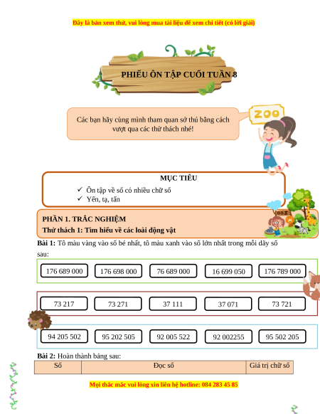 Bài 1: Tô màu vàng vào số bé nhất, tô màu xanh vào số lớn nhất trong mỗi dãy số sau: 176 689 000 176 698 000 76 689 000 16 699 050 176 789 000 73 217 73 271 37 111 37 071 73 721 94 205 502 95 202 505 92 005 522 92 002255 95 502 205