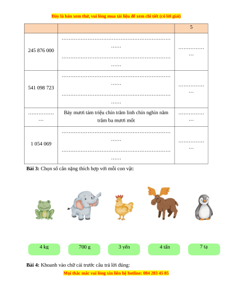 Bài 3: Chọn số cân nặng thích hợp với mỗi con vật: 4 kg 700 g 3 yến 4 tấn 7 tạ
