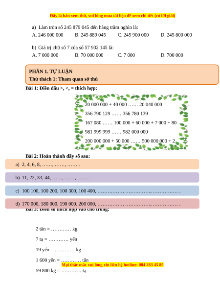 b) Giá trị chữ số 7 của số 57 932 145 là: A. 7 000 000 B. 70 000 000 C. 7 000 D. 700 000 PHẦN 1. TỰ LUẬN