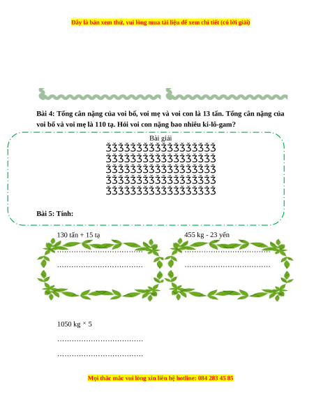 Bài 4: Tổng cân nặng của voi bố, voi mẹ và voi con là 13 tấn. Tổng cân nặng của