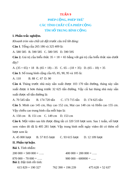 TUẦN 9 PHÉP C N Ộ G, PHÉP TRỪ CÁC TÍNH CH T Ấ C A Ủ PHÉP C N Ộ G TÌM S Ố TRUNG BÌNH C N Ộ G I. Phần tr c nghi ắ m ệ .