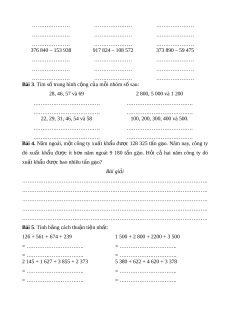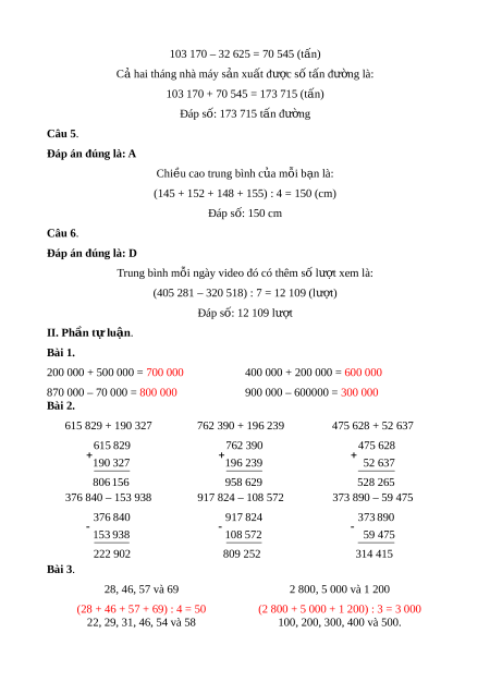 ỗ ngày video đó có thêm số lư t ợ xem là: A. 45 000 lư t ợ B. 57 815 lư t ợ C. 93 615 lư t ợ D. 12 109 lư t ợ II. Phần t l ự u n ậ . Bài 1. Tính nhẩm: 200 000 + 500 000 = ….. 400 000 + 200 000 = ….. 870 000 – 70 000 = ….. 900 000 – 600000 = ….. Bài 2. Đ t ặ tính r i ồ tính: 615 829 + 190 327 762 390 + 196 239 475 628 + 52 637 ………………… ………………… ………………… ………………… ………………… ………………… ………………… ………………… ………………… 376 840 – 153 938 917 824 – 108 572 373 890 – 59 475 ………………… ………………… ………………… ………………… ………………… ………………… ………………… ………………… …………………