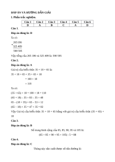 …………………………………………………………………………………………. ĐÁP ÁN VÀ HƯ N Ớ G D N Ẫ GI I Ả I. Phần tr c nghi ắ m ệ . Câu 1 Câu 2 Câu 3 Câu 4 Câu 5 Câu 6 D A B C A D Câu 1. Đáp án đúng là: D Ta có: 265 186 325 409 590 595 V y ậ tổng c a