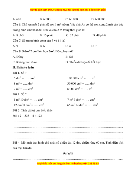 D. Thiếu dữ kiện để kết luận II. Phần tự luận Bài 1. Số ? 5 dm2 = ….. cm2 100 000 cm2 = ….. m2 8 m2 = ….. dm2 30 000 cm2 = ….. dm2 7 m2 = ….. cm2 6 000 dm2 = ….. m2 Bài 2. Số ? 1 m2 10 dm2 = ….. dm2 7 m2 3 dm2 = ….. cm2 12 dm2 8 cm2 = ….. cm2 65 m2 12 dm2 = ….. dm2