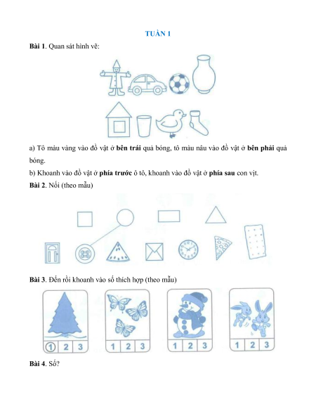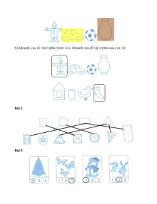 b) Khoanh vào đồ vật ở phía trước ô tô, khoanh vào đồ vật ở phía sau con vịt. Bài 2. Bài 3.