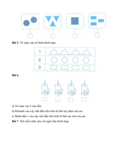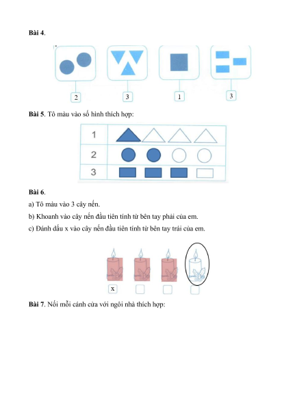 Bài 5. Tô màu vào số hình thích hợp: Bài 6. a) Tô màu vào 3 cây nến.