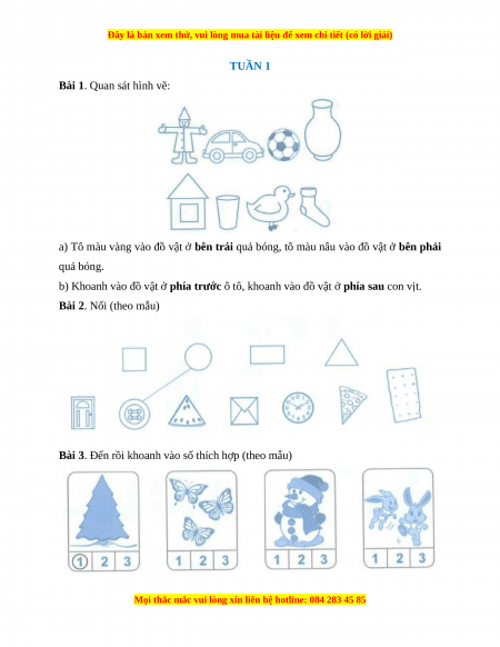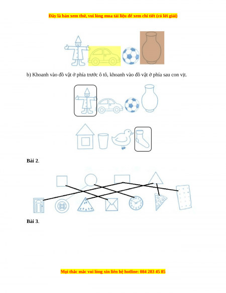 b) Khoanh vào đồ vật ở phía trước ô tô, khoanh vào đồ vật ở phía sau con vịt. Bài 2. Bài 3.