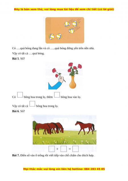 Vậy có tất cả ….quả bóng. Bài 5. Số? Có bông hoa trong lọ, thêm bông hoa vào lọ. Vậy có tất cả bông hoa trong lọ. Bài 6. Số?