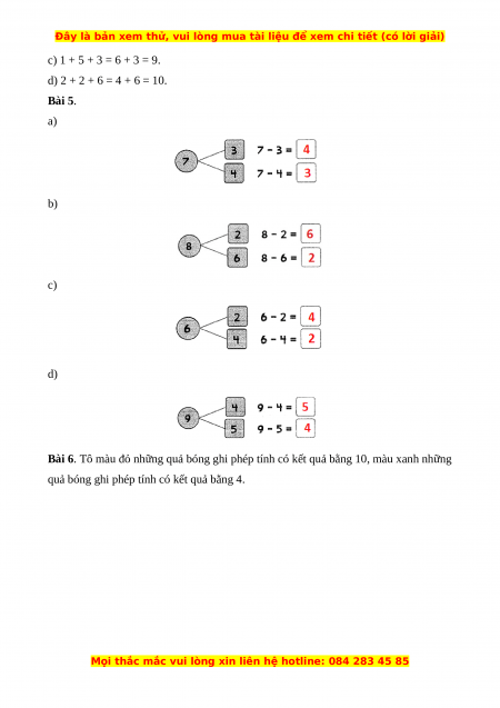 Bài 6. Tô màu đỏ những quả bóng ghi phép tính có kết quả bằng 10, màu xanh những