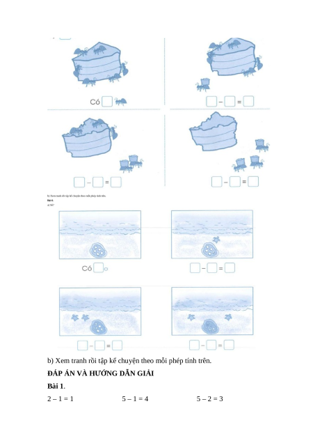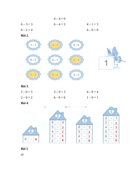 ĐÁP ÁN VÀ HƯỚNG DẪN GIẢI Bài 1. 2 – 1 = 1 5 – 1 = 4 5 – 2 = 3 4 – 4 = 0 6 – 3 = 3 6 – 4 = 2 4 – 1 = 3 6 – 2 = 4 6 – 6 = 0 Bài 2. Bài 3. 5 – 0 = 5 3 – 0 = 3 4 – 0 = 4 2 – 0 = 2 6 – 0 = 6 1 – 0 = 1 Bài 4. 2 3 3 2 2 4 1 1 5 0 0 0 0 Bài 5 a)