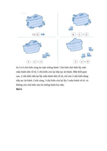 b) Có 6 chú kiến cùng ăn một miếng bánh. Chú kiến thứ nhất lấy một