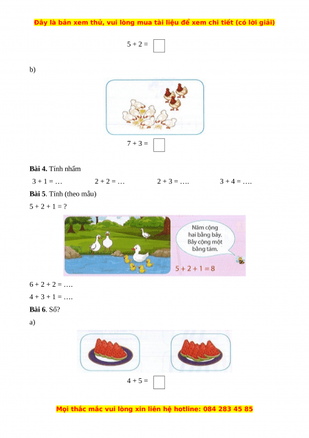 Bài 5. Tính (theo mẫu) 5 + 2 + 1 = ? 6 + 2 + 2 = …. 4 + 3 + 1 = …. Bài 6. Số? a) 4 + 5 =