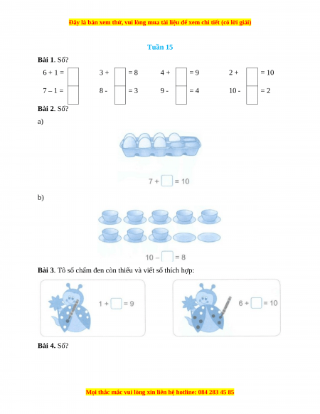 Tuần 15 Bài 1. Số? 6 + 1 = 3 + = 8 4 + = 9 2 + = 10 7 – 1 = 8 - = 3 9 - = 4 10 - = 2 Bài 2. Số? a) b)