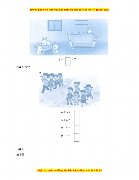 3 + = 7 Bài 5. Số? 4 + 5 = 5 + 4 = 9 – 5 = 9 – 4 = Bài 6. a) Số?