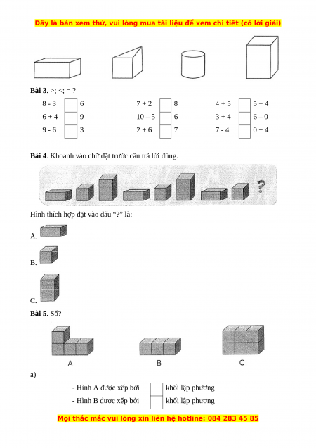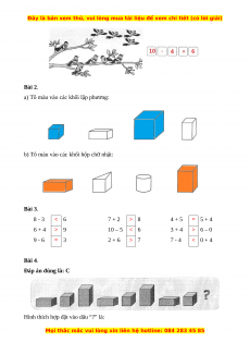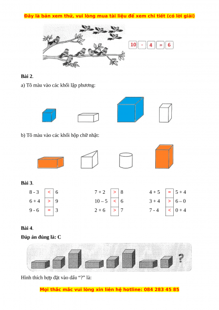 b) Tô màu vào các khối hộp chữ nhật: Bài 3. 8 - 3 < 6 7 + 2 > 8 4 + 5 = 5 + 4 6 + 4 > 9 10 – 5 < 6 3 + 4 > 6 – 0 9 - 6 = 3 2 + 6 > 7 7 - 4 < 0 + 4 Bài 4. Đáp án đúng là: C